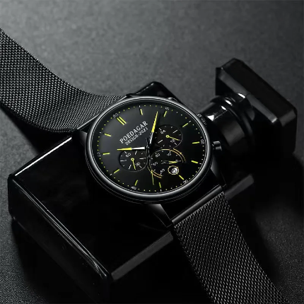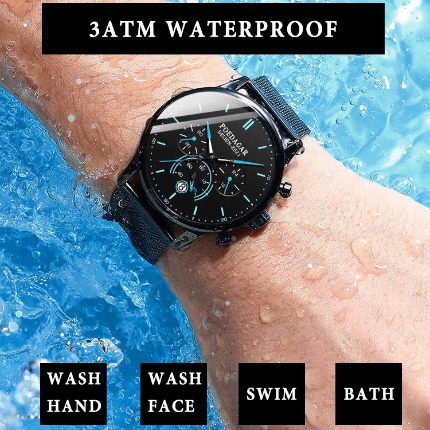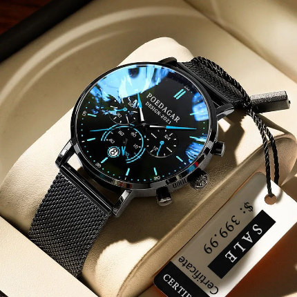 - Â This square-cased option has a 40mm stainless steel case, a black dial, luminous hands, a date window, and is water-resistant to 30 meters